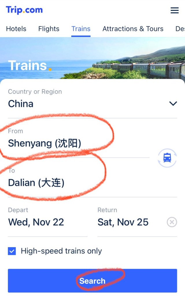 You click that, and it takes you to “Train” section where you can type in “Departure” as “Shenyang” and “Destination” as “Dalian.”