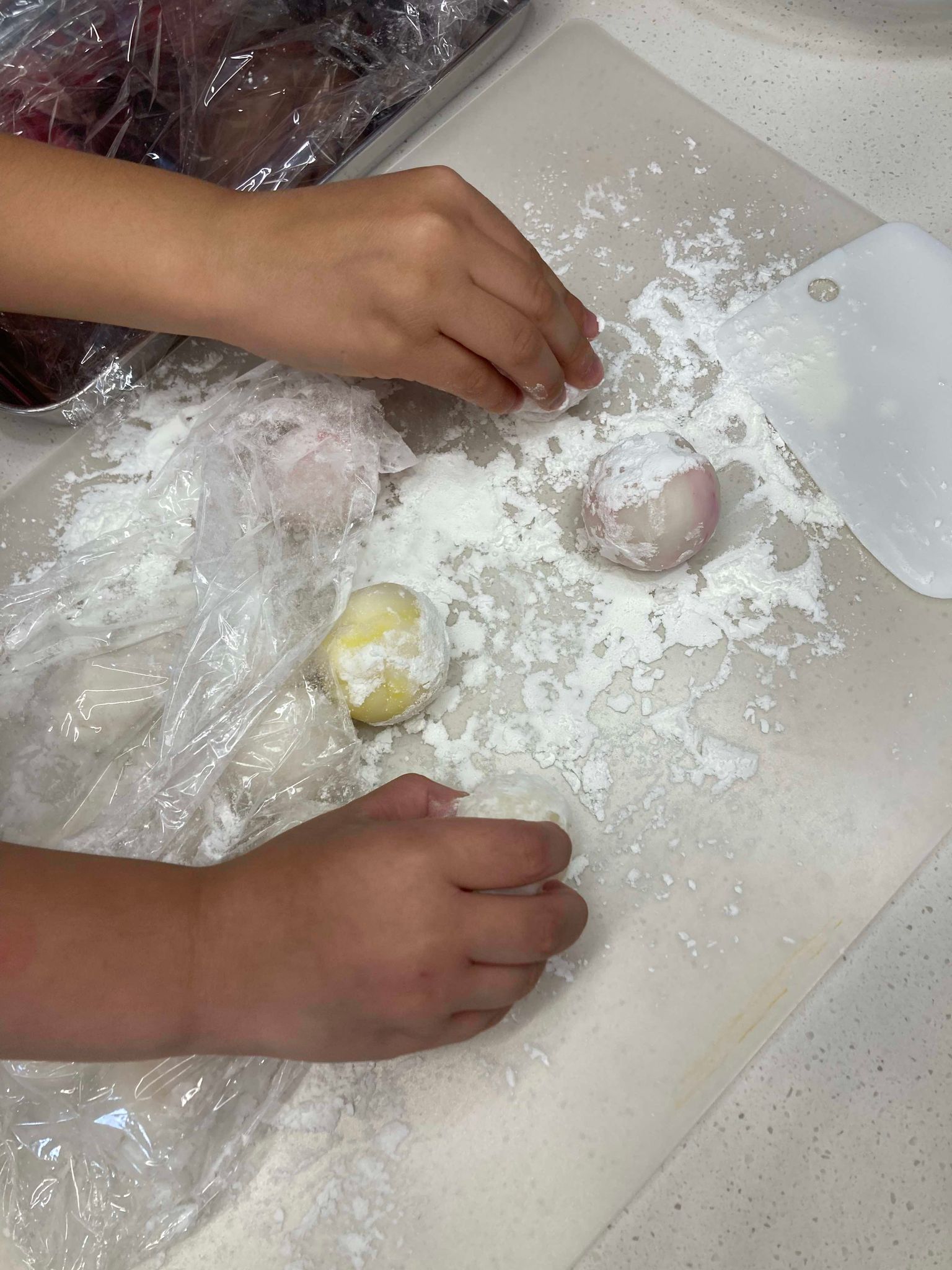 In the picture above, my daughter is having a difficult time to close the mochi after wrapping the filling because I sprinkled too much corn starch.