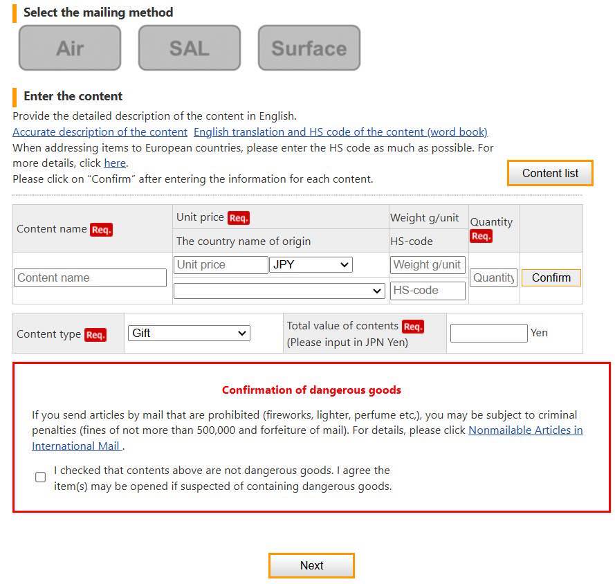 Finally, check the box for “Confirmation of dangerous goods,” then click “Next” to proceed to the “Mailing-related Information” page.