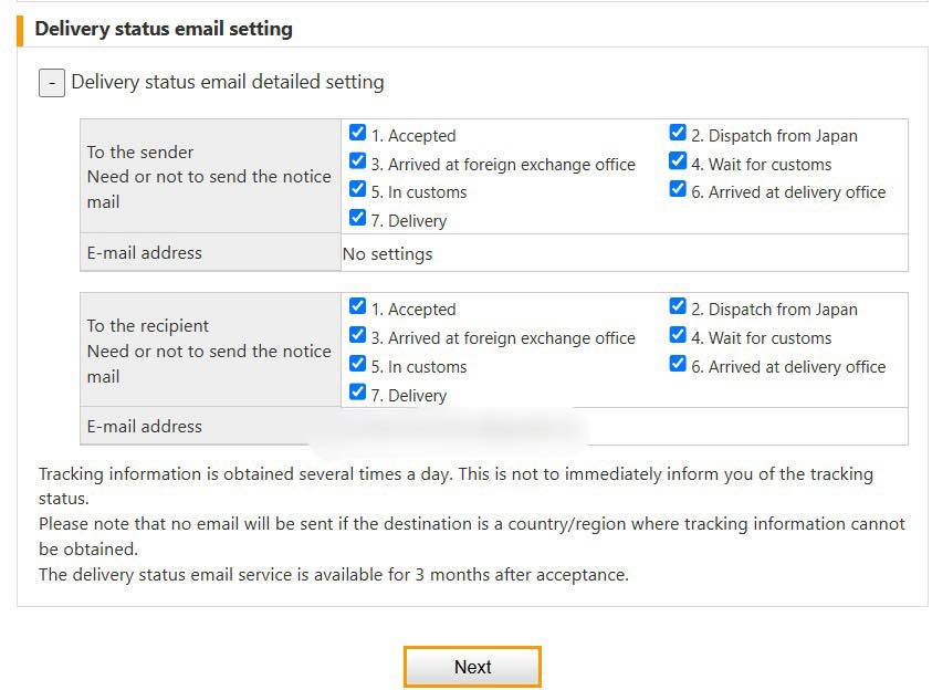 For the delivery status, if you click “Delivery status email detailed setting” as the “+” and check all the boxes (I check all of them), you will receive emails regarding the status of your package, which is reassuring. Once you’ve completed all entries, print the label and take it along with the package to your nearest post.